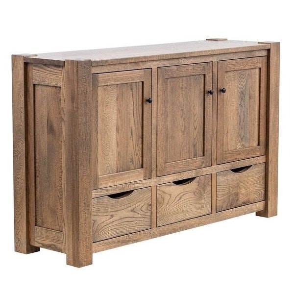 The Maddox Sideboard showcases a handsome, robust aesthetic that blends classic furniture design with clean, modern sensibilities. Its strong lines, defined by distinctive frame detailing on the sides and subtly inset panel doors, create a substantial and refined look. The warm tones and natural grain of the solid wood add organic beauty. At the same time, the practical layout—featuring three upper cabinet doors and three lower drawers with sleek cutout pulls—offers ample, organized storage.
