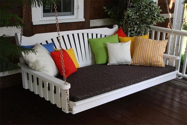 Unfinished, stained or painted can be accommodated with this custom made swing bed. Our sensational collection of Sundown fabrics makes it easy and fun to design this outdoor swing. Select cushion colors and throw pillows that contribute to a cozy scene.