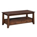 The tables complement this ease with practicality. The coffee table, a standout in the set, features a substantial solid wood top that sits above a lower shelf—perfect for stacking books or displaying decorative items—and a pair of drawers to tuck away remotes, coasters, or other living room essentials. The end table mirrors this functionality, providing a convenient surface for lamps or drinks while maintaining the set’s cohesive look.