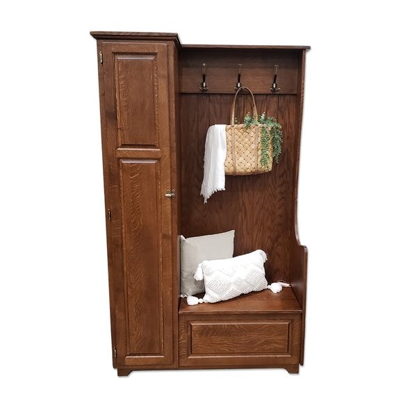 We think you'll enjoy living with the Amish McCord Hall Seat in the foyer or hallway. This tree bench is gentle, beautiful and full of function. The bench opens to store items and the slender cabinet door adds character, opening to a collection of shelves perfect for sweaters, boots, blankets and more. Three hooks line the top to keep outerwear organized and off the furniture.