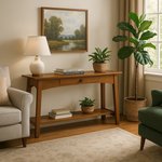 This mission-style sofa table features a clean design that will pair well with a variety of furniture styles. Other details include a 1-inch thick solid top with reversed bevels, arching aprons on the front and sides under the top, exposed mortise and tenon joinery, and slightly slanted legs (by design) that help to give this versatile table a contemporary feel. The dovetailed drawer with a maple drawer box is built on soft close slides, fully extends, and features a fully inset front.