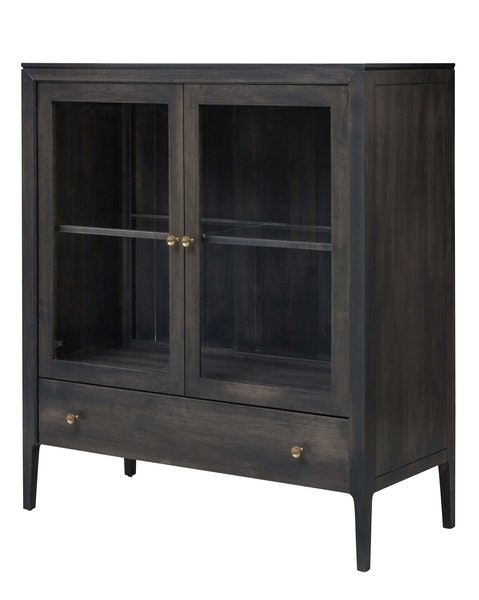The two glass doors frame the cabinet’s interior, inviting you to display collectibles, fine china, or family photos—each item highlighted by the clear glass that keeps them protected yet visible. Inside, a single glass shelf offers versatile space to arrange and organize your treasures, ensuring even small items stand out. Below, a bottom drawer provides discreet storage for linens, serving pieces, or other items you prefer to keep tucked away, adding layers of utility to its design.