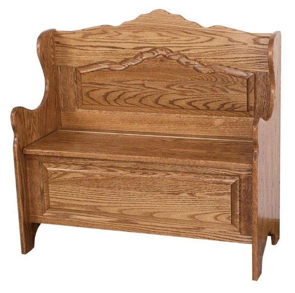 A tool to keep any room tidy, the Amish Middleburg Raised Panel Storage Bench brings the country style and charm you love to your American home furniture collection. Enjoy storage and a cozy seat with this solid wood country bench. The Middleburg offers a bench back that is cut to resemble a scenic mountaintop. The raised panel of the bench features the same design. Arms are curvy and inviting, offering plenty of warm country charm.