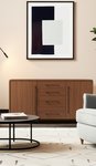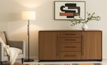 Discover the captivating elegance of the Amish Mirage 4-Drawer Modern Sideboard Buffet, a piece where sophisticated design meets exceptional Amish artistry. This sideboard is distinguished by its unique softened silhouette, featuring beautifully rounded edges that flow seamlessly from the top surface down its sides, creating an inviting, organic feel that stands apart from typical sharp-lined modern furniture. Crafted entirely from solid wood, its natural grain is allowed to shine, complemented by sleek, contrasting black bar pulls that punctuate the doors and drawers with a contemporary edge. The integrated, subtly recessed base further enhances its refined profile, giving the impression of lightness and grace, making it a true centerpiece that effortlessly complements modern and transitional interiors. Beyond its striking aesthetic, the Amish Mirage Sideboard is a testament to unwavering quality and master craftsmanship. Each cabinet is meticulously handcrafted by skilled Amish artisans using time-honored techniques, ensuring a piece of furniture that is not only visually stunning but built to endure for generations. From the solid wood construction, chosen for its inherent strength and beauty, to the precision joinery, every detail speaks to a commitment to excellence. The drawers are built with robust dovetail construction and operate smoothly on full extension drawer slides, promising effortless access and dependable functionality for years to come. This modern sideboard offers storage designed for the demands of contemporary living. Its balanced configuration includes two spacious cabinet doors flanking a prominent central stack of four generously sized drawers. These drawers provide ample, easily accessible storage for dining essentials, linens, or media accessories, while behind each door, an adjustable shelf offers flexible space to accommodate larger items, ensuring everything has its rightful place. Available in various widths, from 64" to a grand 84", you can select the perfect size to fit your space, and further customize your buffet by choosing your preferred solid wood and finish, allowing you to design a piece that is truly unique to your home.Order today online, over the phone, or at one of our showroom locations.