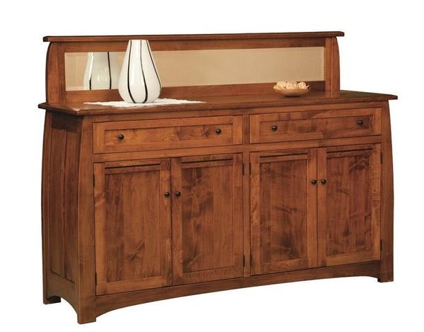 Organize your household items inside the multiple doors and drawers of this buffet that are accented by custom hardware of your choice. The mirrored backsplash is a nice standard feature that adds depth to the buffet and offers a great presentation of any items being displayed on the solid wood buffet top or for your home cooked meals being laid out during dinner parties or family get-togethers. Enjoy watching your friends and family gather in your dining room and making their plates around this impressive buffet.