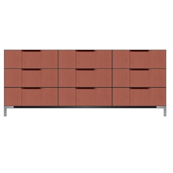 Its nine drawers are arranged in a clean, grid-like layout, each featuring a contemporary front with crisp, unadorned lines that emphasize simplicity and sophistication. The metal base, with its low profile and understated silhouette, lifts the dresser subtly, adding a touch of airiness while complementing the rich, natural tones of the brown maple wood. This contrast of materials—warm wood and cool metal—infuses the piece with a fresh, modern edge that works beautifully in both minimalist and transitional spaces.