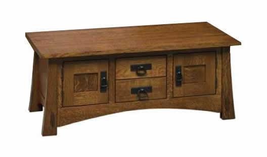 Form and function is part of what Mission style is all about, and our Amish Montana Mission Coffee Table does not disappoint. With two drawers and two doors, this beautiful coffee table offers lots of functional storage space. A one-inch thick and solid wood construction offer the durability and strength you are looking for. Angled legs and a curving base design offer interest, as can the wood type and hardware you select for the piece.