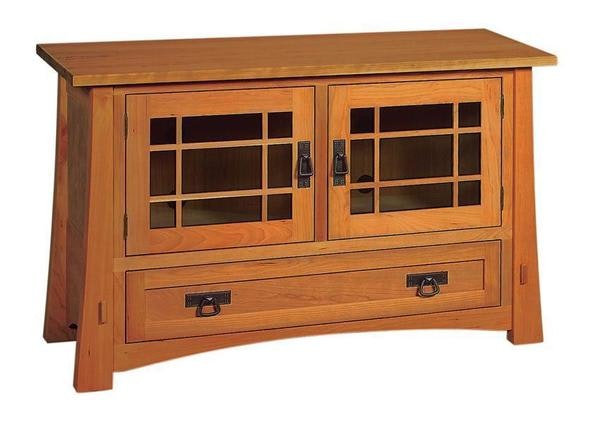 Available in two depths, this mission-style entertainment center includes a 1-inch thick top, one CD-DVD accessible drawer with soft-close undermount slides and a maple, dovetailed drawer box.
