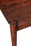 A closer look reveals thoughtful design details that set it apart. The tabletop features a smooth, curved edge that softens the silhouette, creating a gentle, inviting profile. Below, slender, tapered legs rise from the floor—their clean, streamlined shape adds an airy quality, keeping the piece from feeling heavy while ensuring sturdy support. Connecting the legs is a gracefully arched stretcher that reinforces the structure and echoes the curve of the tabletop, tying the design together with harmonious symmetry.