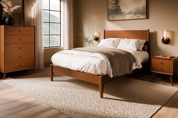 Flanking the bed, the 5-drawer chest and 2-drawer nightstand echo this thoughtful design language. Both pieces feature the same tapered legs and simple, unadorned fronts, creating a harmonious flow that ties the room together. The chest offers ample storage for linens, clothing, or keepsakes, while the nightstand provides a convenient spot for your bedtime essentials—all without sacrificing style.