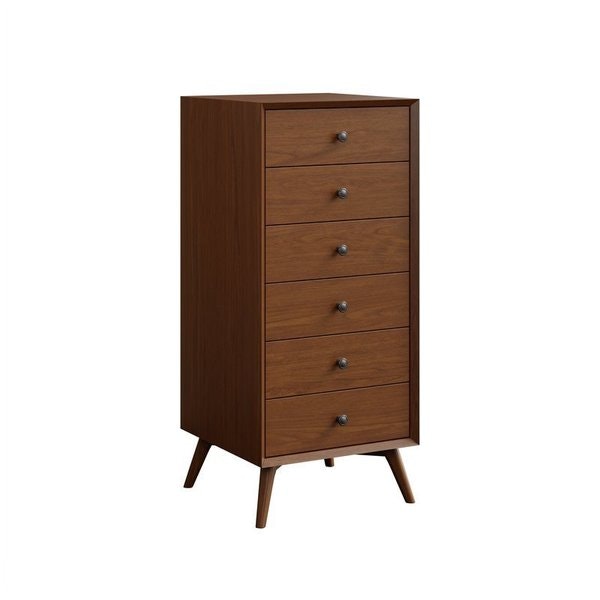 What catches the eye first is its balanced, streamlined silhouette. The vertical orientation makes it ideal for tighter spaces—a boon for smaller bedrooms or walk-in closets—while the tapered, splayed legs add a subtle, modern lift. These legs angle gently outward, giving the chest an airy quality that prevents it from feeling heavy, even as it stands sturdy and reliable. The clean, flat drawer fronts, free from fussy detailing, let the natural grain of the wood shine, creating a look that’s both timeless and fresh.