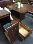 It is complete with two drawers on each end of its L-shape, as well as two pull-out doors for your convenience. One of these pull-out doors has a waste basket while the other features shelves with soft close glides. This feature is perfect for extra pantry items or anything you need to keep handy.