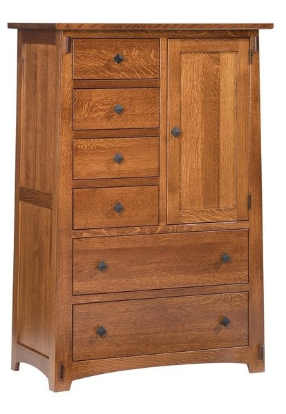 This solid wood gentleman's chest seamlessly combines Amish craftsmanship with contemporary Shaker design. The Amish Olde Shaker Gentleman’s Chest is highly valued for its practical functionality and mission-style simplicity, helping to create a clutter-free, light-filled environment that promotes a calming atmosphere. It’s versatile enough to be placed in a bedroom, den, home office, living room, hallway, or any space in your home or office. Unlike a standard chest of drawers, this gentleman’s chest features a wardrobe section for hanging suits and other formal attire, alongside six deep drawers for storing accessories and other personal items.