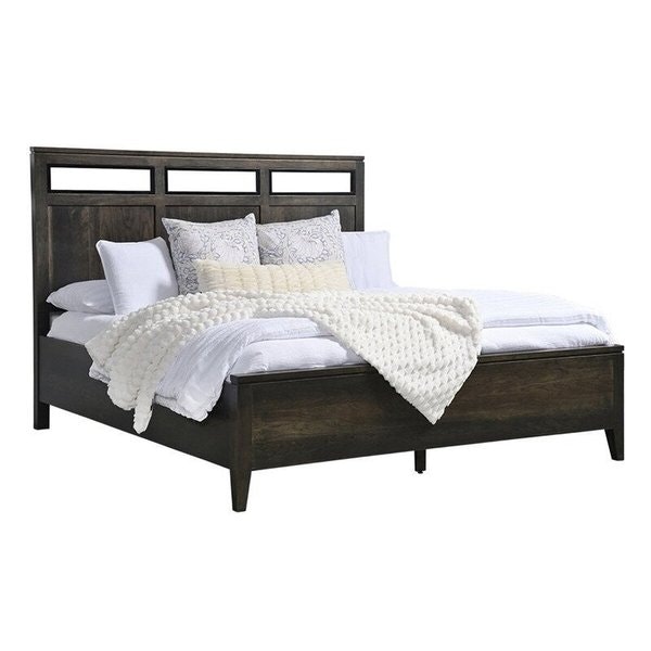 The Oliver Panel Bed with Black Inserts strikes a thoughtful balance between modern flair and enduring craftsmanship, making it a standout centerpiece for any bedroom. Its design is defined by a striking headboard that commands attention without overwhelming the space. Standing at 58 inches tall, the headboard features three rectangular cutouts framed by solid wood, each accented with sleek black inserts—details that add a contemporary edge while highlighting the natural beauty of the wood. This contrast creates visual interest, allowing the bed to serve as a focal point that complements both minimalist and layered decor styles.