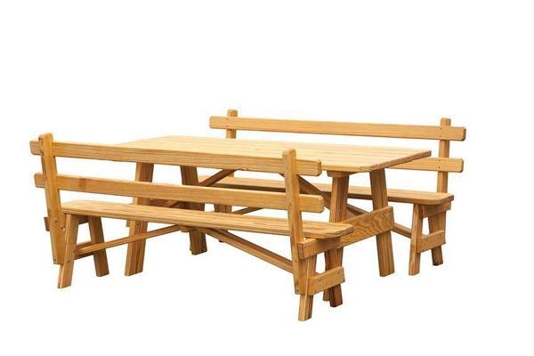 Kick back and enjoy the backyard with a new outdoor dining sets that is proudly made in the USA. This pine picnic table set is Amish made from solid pine wood. It includes one picnic table and two 72" long benches. You can choose to have the southern yellow pine wood unfinished or stained in a gold or cedar color. If you order the picnic set unfinished you can finish it yourself with a wide variety of stains or paints from your local hardware store. Seat six comfortably at this outdoor wooden table using the two benches included with a purchase.