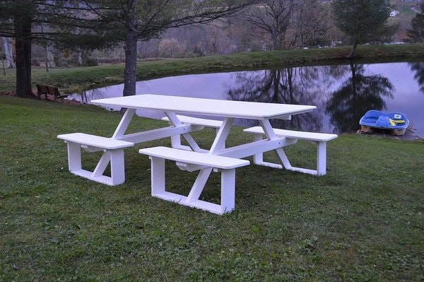 Sitting up to 8 people, this walk-in table is made from poly lumber, recycled material made from milk jugs. This purchase is a purchase worth feeling great about knowing that less plastic was sent to our landfills with the production of this table!