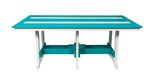 What sets this table apart is its thoughtful design: the tabletop features alternating horizontal slats in complementary colors, creating a fresh, coastal-inspired look that adds character to any outdoor space. The clean lines of the trestle-style base, with sturdy crossbars for stability, not only support the table with confidence but also add a touch of rustic charm.