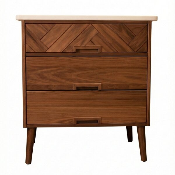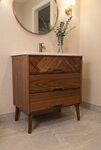 There’s something quietly captivating about walking into a bathroom that feels intentional—where every line is clean, every detail purposeful, and every surface reflects lasting quality. The Amish Made Portofino Mid-Century Modern Bathroom Vanity was created for exactly that moment. It doesn’t shout for attention. It earns it. At first glance, your eye is drawn to the striking geometry of the drawer fronts. The subtle herringbone-inspired pattern creates movement and depth, allowing the natural grain of solid hardwood to tell its own story. Each board is carefully selected, revealing warm tones and organic character that mass-produced vanities simply cannot replicate. This is where artistry meets restraint—the hallmark of true Mid-Century Modern design. The gently tapered legs elevate the cabinet both visually and physically, creating an airy, open feel that makes your bathroom appear larger and more refined. Flush inset drawers and doors sit perfectly aligned within the frame, a sign of precision craftsmanship that only experienced Amish woodworkers can achieve. There are no shortcuts here—only time-honored techniques, steady hands, and pride in every joint. Open a drawer, and you’ll feel the difference immediately. The smooth glide of premium undermount soft-close slides and the strength of dovetailed maple drawer boxes remind you that beauty means nothing without durability. Concealed soft-close hinges protect the clean exterior lines, preserving the vanity’s sleek silhouette while ensuring effortless use for years. Customers love Mid-Century Modern furniture because it brings balance to a space. It feels both nostalgic and fresh. It softens modern rooms and modernizes traditional ones. It never overwhelms—it complements. The Portofino vanity embodies this philosophy perfectly, offering warmth, simplicity, and timeless appeal that will still feel relevant decades from now. Handcrafted in America by skilled Amish artisans and exclusively offered by DutchCrafters, this vanity is built one piece at a time—not on an assembly line, but in a workshop where craftsmanship still matters. You can choose from a variety of premium hardwoods to create a vanity that feels personal to your home and your story. This isn’t just a bathroom vanity. It’s the piece that transforms your morning routine. The piece guests notice. The piece you’ll appreciate every single day. Bring home the warmth, craftsmanship, and unmistakable style of the Portofino Mid-Century Modern Bathroom Vanity, and create a space that feels beautifully, authentically yours. Contact one of our design consultants today for questions, to order wood finish samples, or help with creating the perfect bathroom vanity for your home or business. Note: The top is not included.See more bathroom vanities and more from our Weston Collection.