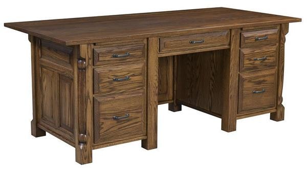 A solid 1" thick desktop provides a grand space to work on and pullout writing boards above each pedestal offer even more room. There's a hanging file rail in each bottom drawer for records. With Amish furniture, we offer you options to customize. Have a hidden compartment built into this Amish desk and add the locks and hardware that you like best.