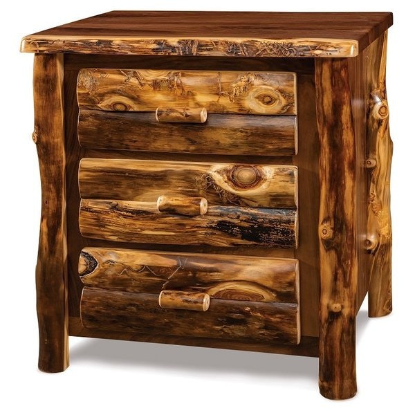 The look of log furniture just makes it feel like you're on vacation. The warm, cozy and welcoming look of the Amish Aspen Log Nightstand with Three Drawers adds just the right touch to a log cabin bedroom. This essential piece of bedroom furniture offers just the storage you're looking for bedside, all in rustic log style.