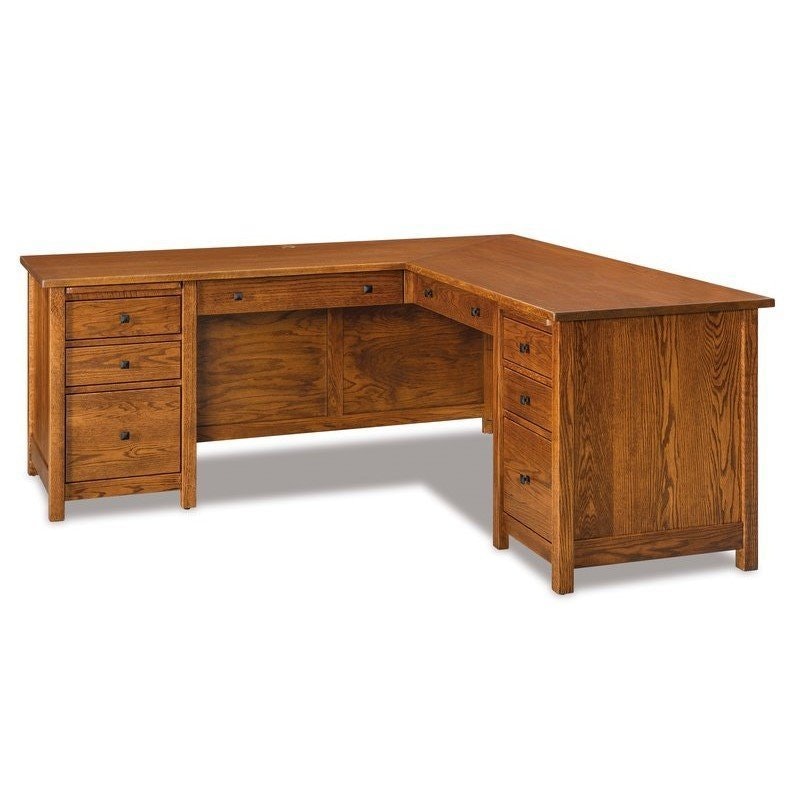 This L Desk features eight drawers, with plenty of storage for all your office needs. This Mission-style L Desk is proudly made in America by Amish woodworkers. Mission-style furniture blossoms with its ability to fit into any existing decor. The desk is constructed with mortise and tenon joints, which is also customary of the Mission-style. Finished by meticulous hand sanding, all pieces of this desk are left with the softest touch.