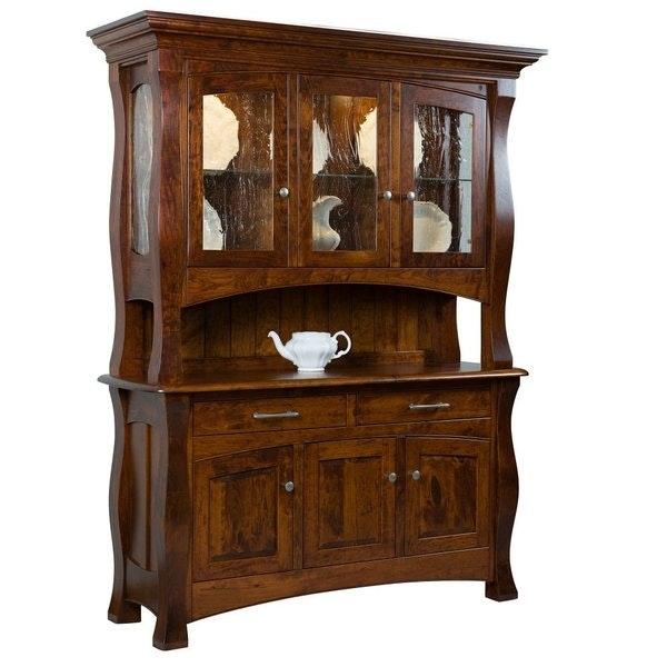 Make a statement in your kitchen or dining room with our Amish-made Webb 3-Door Hutch Cabinet that is handcrafted using solid wood and premium materials. This stunning buffet and hutch has beautiful curves that highlight the wood selected. There is plenty of storage space inside this cabinet with two flush wood doors covering the shelf that runs the length of the base and two storage drawers above for additional napkins, utensils, and more! Show off your collectibles, china and crystal on the adjustable glass shelf in the beautiful LED touch light display space behind your choice of beveled or glacier glass.