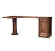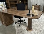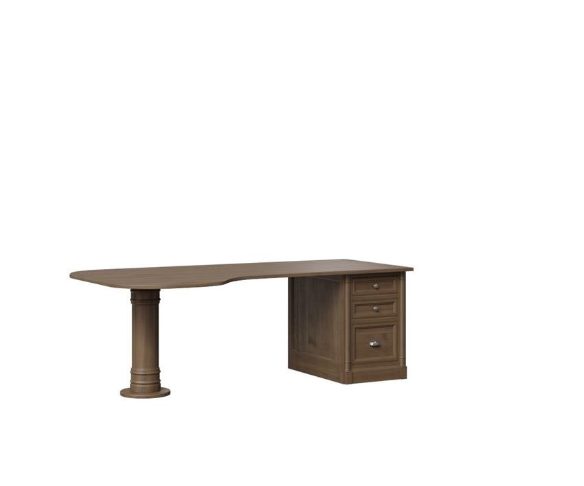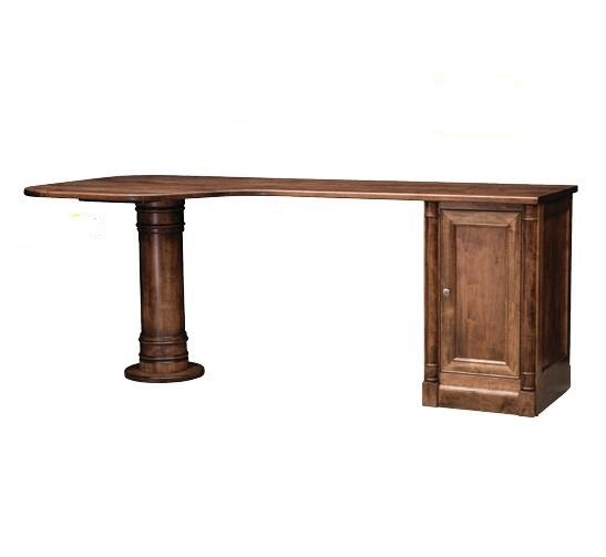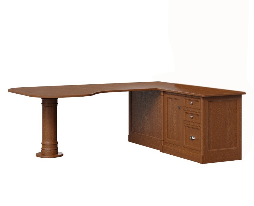 This pedestal desk features a unique style. Its thick, solid, turned leg supports the curved desk while the optional credenza and bookcase rest against your walls.