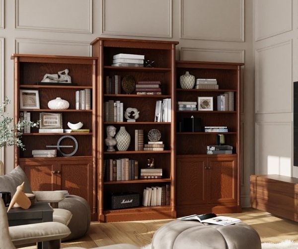 Designed with intention, the bookcase features a harmonious arrangement of center and side sections. The side bookcases offer the perfect mix of open shelving above and closed bottom doors below, providing hidden storage for items you prefer to keep out of sight while keeping frequently used books or decor easily accessible. The taller center section draws the eye upward, creating a balanced, tiered silhouette that adds visual interest to your wall without overwhelming the space.
