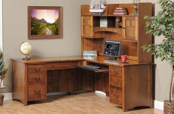 Pair one exquisite solid wood executive desk with an impressive hutch top and you've got the Amish Rivertowne Mission L-Desk with Optional Hutch Top providing a handcrafted workstation for your home office or business. Equipped with storage space, solid wood style and your signature customizations, this mission style desk is ready for action. Mission style office furniture like the Rivertowne, keeps it simple, with Amish craftsmanship you can count on to be strong and durable. The Rivertowne Mission L-Desk is made in Ohio and offers a premium quality desk that will serve for generations.