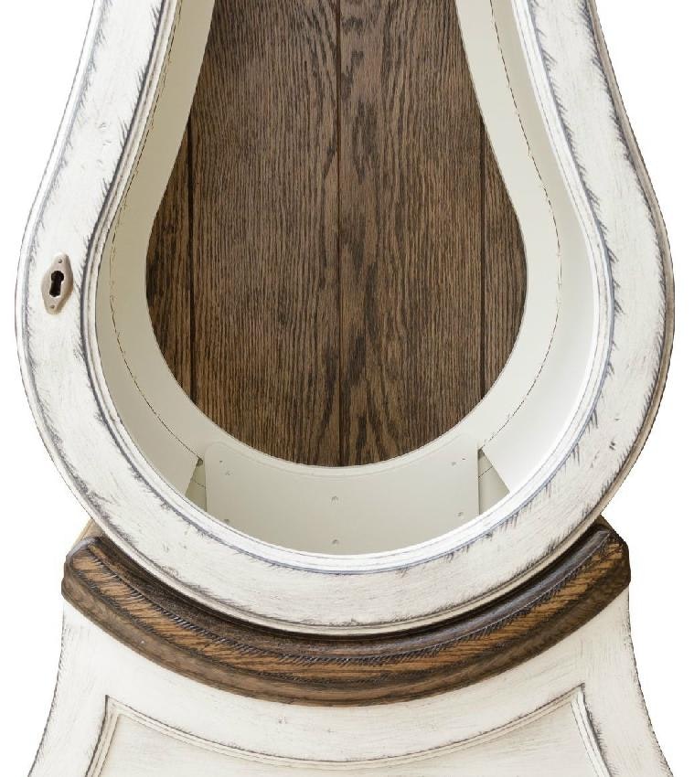 The large 88" frame is topped with a classically inspired swan neck arch, surrounding a finial detail in the middle that provides a beautiful, Old World antique feel to the entire piece. Below, two reeded columns surround a arched, beveled glass door that safely secures the beautiful details inside. Once open, you'll reveal the polished dial, complete with beautiful detailing around a classic numeral face and intricate hands that display the time. Above, a moon phased and calendar will give you the lunar cycle and day at a glance.