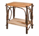 Who says handcrafted Amish furniture has to take months to arrive? With our Quick Ship Amish Hickory Twig End Table, you can enjoy the beauty and durability of authentic rustic furniture without the long wait. Perfect for rustic-inspired homes, cabins, or lodges, this versatile accent table brings warmth, character, and practicality wherever it’s placed. Each table is thoughtfully made with hand-bent hickory twigs, forming delicate cross supports on the ends and a charming arch across the front and rear. The solid top and lower shelf are crafted from domestically sourced hickory wood, chosen for its natural strength and eye-catching bark. Every leg, twig, and detail is carefully selected to ensure that no two tables are alike—making your piece truly unique. Hickory is not only beautiful but also highly sustainable. Its fast-growing saplings regrow within 3-5 years, preserving the tradition of time-honored Amish woodworking while caring for the environment. With this table, you’re not just bringing rustic elegance into your home—you’re supporting sustainable craftsmanship that lasts for generations. Choose your finish and wood options to match your décor or create a striking new centerpiece. Our Friendly Furniture Specialists are ready to help with any questions or customization ideas, making it easy to create a rustic end table that’s uniquely yours. Order your Quick Ship Amish Hickory Twig End Table today and enjoy handcrafted beauty without the wait!See more products from this woodshop: Blue Mountain Hickory Collection