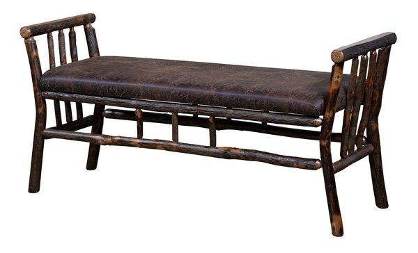 The Amish-made Rustic Hickory 48" Bench is subtly inspired by mission style furniture. Hickory twig slats are accented on each arm rest adding a unique spin on age-old mission feature. Three hand-crafted slats are centered below the seat cushion creating a signature accent.