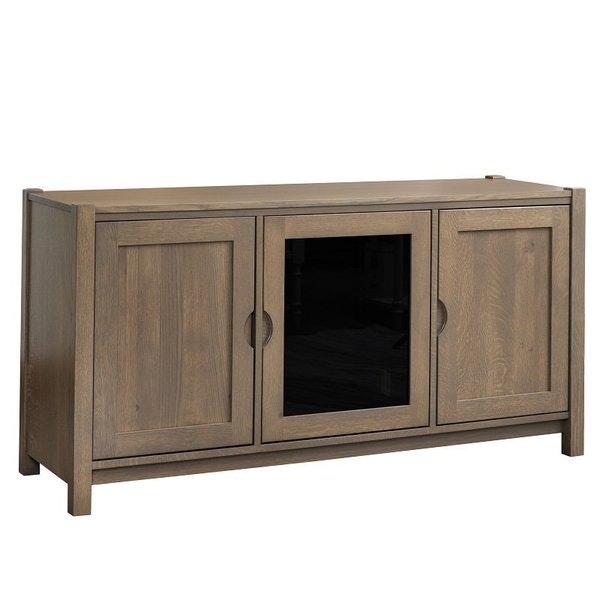 What stands out most is its thoughtful door configuration: two solid wood doors on the sides tuck away remotes, cables, or extra devices, while a central glass door adds a subtle, airy touch—ideal for displaying a favorite sound system or decorative accents without sacrificing privacy. The doors feature notched pulls, a simple yet distinctive detail that adds character without fuss, keeping the focus on the natural beauty of the wood and the stand’s clean lines.