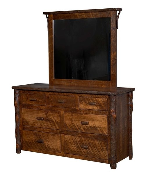 The Amish Settler's 7-Drawer Dresser brings a touch of rustic warmth and practical elegance to any bedroom, blending the charm of nature with the reliability of handcrafted furniture. Its design celebrates the natural beauty of wood, starting with the rough-cut maple and hickory that give the piece a textured, organic feel—think the weathered character of a forest find, polished into a functional work of art. The dresser’s sides and legs mimic the gnarled, sturdy look of tree trunks, adding a unique, earthy personality that turns a simple storage piece into a conversation starter.