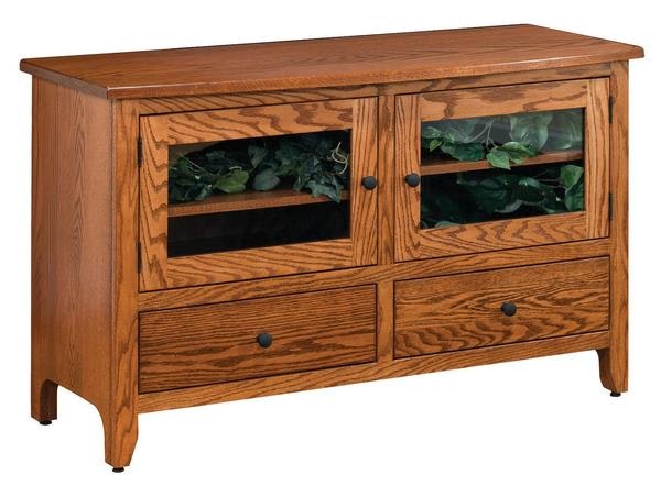 Available in four widths, our Amish McFadden Flat Wall TV Stand will add a classic style to your living room. This stand includes solid arched top, clean lines, two full extending dovetailed drawers, and doors. Glass doors on these units are flat paneled. Solid wood doors have a Shaker style panel design. On shelf can be found behind the doors.
