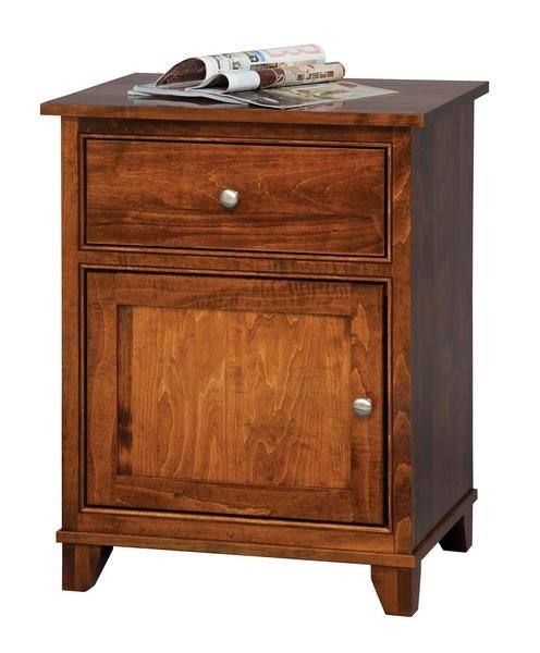 Add the Amish Shoreline One Drawer One Door Nightstand to your bedroom for handy bedside storage that you can utilize for many years! This solid wood nightstand can be crafted in one of our four hardwoods and your favorite finish color. This Amish nightstand is shown in brown maple wood with Michael's Cherry finish, you can get it exactly as shown or choose your own wood and finish combination.