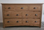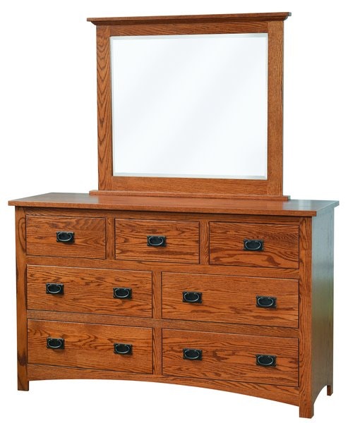 This Amish Siesta Mission Dresser is a beautiful example of the timeless Mission style combined with generations of Amish artistry. At 61" wide and with seven roomy drawers, It will serve as a wonderful storage solution for your bedroom. Regarding inspiration, the Amish artisans took cues from the Arts & Crafts Movement and Stickley Mission style to develop a classic Mission Craftsman Dresser. This dresser offers flat sides that case a range of flush-mounted drawers in front, topped with a thick solid top above and trimmed with a graceful arch that surrounds the classic l-shaped feet. From every angle, this dresser inspires a sense of authentic antique beauty, with the versatility to look great in any bedroom suite. While we've shown this piece in our popular Quarter-Sawn White Oak Wood with Michael's Cherry finish, you have many other hardwoods. Once you select your wood, you'll have the option of stain finish, allowing you to match your existing bedroom storage items or start fresh with your new favorite Mission furniture. The optional beveled-edge mirror is the perfect add-on. Cased in the same gorgeous hardwood and finished with the same stain, it's sure to be perfect for taking one final glimpse as you head out for the day. This dresser comes standard with full-extension side-mount glides, but you can also opt for soft-close under-mounted glides to add a little something extra to the final touches. Pair this Mission dresser with our matching best selling Amish Siesta Mission Bed and a pair of nightstands. If you have questions, please don't hesitate to call and speak with one of our furniture specialists. We are here to help you in any way we can. We have stain samples available to help you confirm your decision. Call us, email, chat, or stop by one of our Amish furniture stores in the destination cities of Sarasota, Florida, and Alpharetta, Georgia.