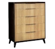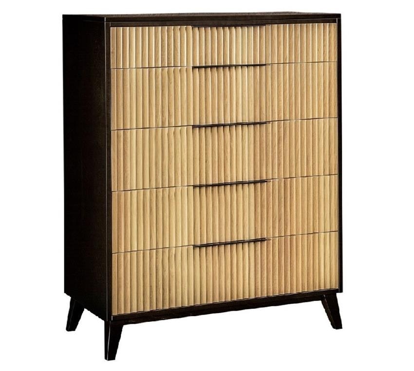 Beneath its stylish exterior, this chest is built for daily use. Five drawers provide ample space for clothing, linens, or accessories, with full extension side mount slides ensuring each drawer glides open smoothly, even when fully loaded. The tapered, dark legs elevate the piece slightly, giving it a light, airy profile while maintaining stability.