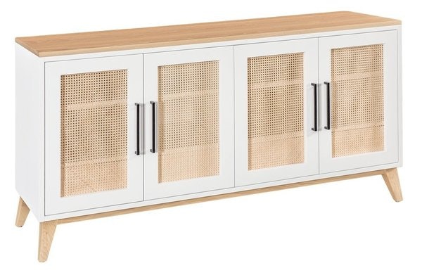 The Amish Sofi 60" TV Stand brings a thoughtful blend of modern charm and timeless craftsmanship to your living space, serving as both a functional media center and a stylish focal point. Its design stands out with delicate woven rattan panels set within crisp white cabinet doors, adding texture and warmth that softens the room while keeping stored items subtly visible. Below, tapered wooden legs angle gently outward, lending a light, airy feel that balances the stand’s substantial presence. The contrast of the white doors against the natural wood top and legs creates a fresh, inviting look that pairs effortlessly with both contemporary and transitional decor.