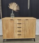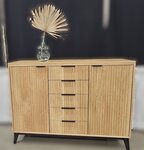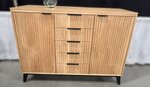 What stands out first is the striking fluted design of the doors and drawers. Vertical ridges run the length of each panel, creating subtle texture that catches the light and adds depth to the piece. This detail transforms the front from a simple surface into a visual focal point, balancing sophistication with a touch of warmth. Complementing this are the sleek, tapered legs—narrowing gently toward the floor—to give the sideboard a light, airy stance that keeps the look from feeling heavy, even with its substantial presence.