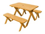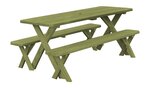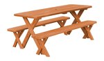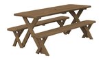 Ready to provide an essential element for your outdoor scene, the Amish Solid Pine Wood Table with Benches create a bright spot to enjoy on your patio or in your backyard. Let the kids enjoy crafts outside, cook up some burgers for a Saturday afternoon meal outdoors, or grab your book and coffee for an evening under the stars. Two benches with a charming cross leg design flank this solid pine wood picnic table, providing plenty of room for a group to gather.