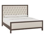 The headboard is a study in understated luxury, featuring pleated tufted fabric arranged in a classic diamond pattern, secured by subtle button tufting that adds texture without overwhelming the design. This upholstered panel is framed by solid wood, which extends to form the bed’s structure, ensuring stability while complementing the fabric’s softness. The footboard, with its clean, low-profile silhouette, balances the headboard’s detail, keeping the overall look airy yet grounded.