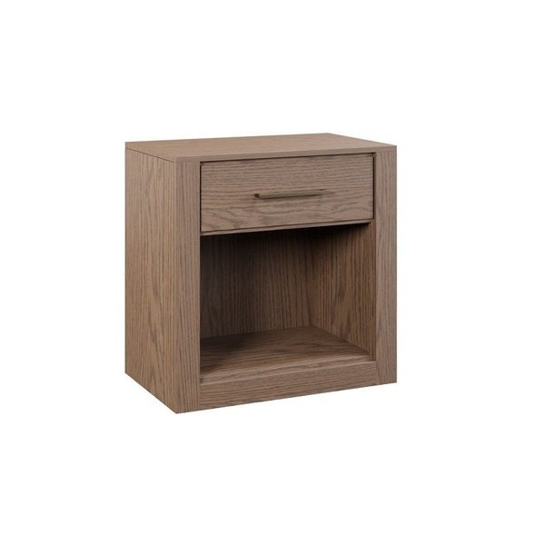 Its silhouette is clean and contemporary, defined by straight, unadorned edges that create a streamlined, boxy profile—no unnecessary flourishes, just a focus on functionality and timeless style. A single drawer takes center stage, featuring a flush front that blends seamlessly into the nightstand’s frame, offering concealed storage for smaller items like reading glasses, a journal, or your phone charger. Below, an open lower shelf provides easy access to a favorite novel, a small plant, or a stack of linens, balancing closed and open storage to keep your bedside both organized and inviting.