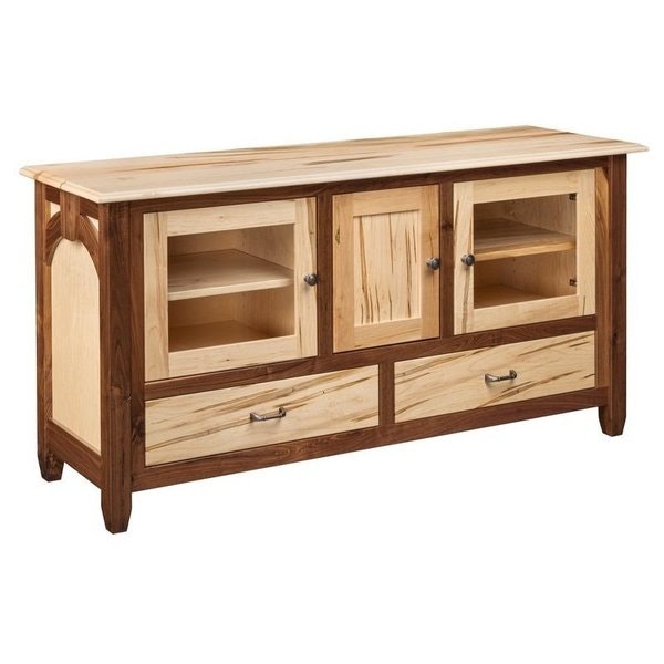 The console’s design balances open and closed storage to suit your needs: two glassless open compartments on either side offer easy access to media players or decorative accents, while a central closed cabinet hides clutter—think extra cables or rarely used devices. Below, two smooth-gliding drawers provide space for remotes, gaming controllers, or other small essentials, keeping surfaces tidy. The contrast between the lighter Maple doors, drawers, and shelves and the darker Walnut trim and frame adds visual interest, highlighting the unique grain patterns of each wood.