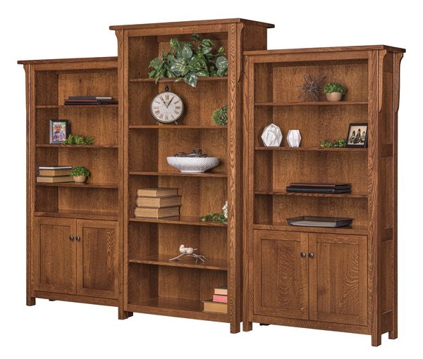 The Amish Three Piece Churchill Bookcase transforms any room into a refined, organized space, offering both functionality and timeless style. Its three-piece design creates a balanced focal point: a taller middle unit anchors the ensemble, flanked by two slightly shorter side bookcases that frame it beautifully. This structure not only adds visual interest but also maximizes both display and storage potential, making it ideal for a study, living room, or home office.