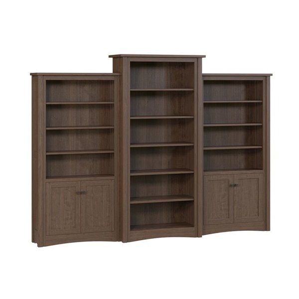 Subtle design details add character: the side bookcases feature a gentle curve along their base, softening the unit’s profile and adding a touch of warmth to its clean lines. Each side unit includes a bottom door, offering convenient concealed storage for items you prefer to tuck away, while the open shelving above invites you to showcase books, family photos, or cherished decor. The center bookcase, with its full-height open shelves, provides ample space for larger collections or statement pieces, making it easy to curate a display that feels personal and intentional.
