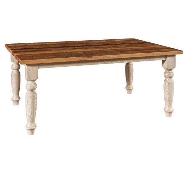 You don't need to look any further if you are looking for a custom farmhouse dining room table. This Amish custom table can be a larger farmhouse table at 15' long or a small 5' table. You can also order it as shown in a two-tone finish or stained. The reclaimed barn wood tabletop option adds to the rustic farmhouse style.