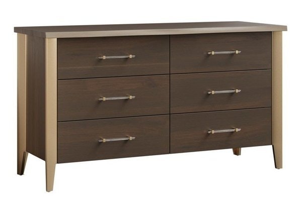Its design shines with thoughtful details that catch the eye. The sleek, tapered metal legs add a contemporary flair, their slender profile contrasting gently with the solid wood frame for a balanced, airy look. A subtly lighter top provides a refined contrast, drawing attention to the dresser’s clean lines and creating visual interest. The six drawers are arranged in a symmetrical, three-row layout, each featuring understated metal accents that complement the legs, tying the whole piece together with a polished, cohesive feel.