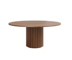 The 60” round table takes center stage, its shape naturally encouraging conversation by ensuring everyone feels included. What truly sets it apart is the base—sleek, substantial, and adorned with vertical grooves that add texture and visual interest without overwhelming the room. This design choice marries form and function: the grooves create a subtle, rhythmic pattern that catches the light, while the solid construction ensures stability, even during lively dinners. The tabletop, 1 ¼” thick and free of an apron, keeps the look open and airy, making the space feel larger and more inviting.
