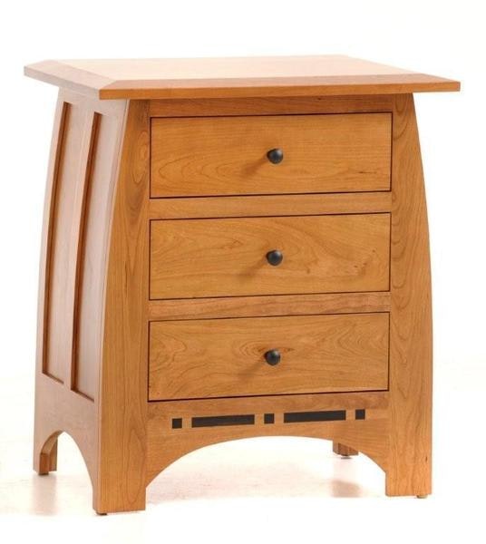 The Napa Valley Nightstand is sure to bring the warmth and comfort you're looking for to any bedroom in your home. Amish crafted by hand, this night stand is built to order and feature three full extension drawers. Below the flush-mounted, dovetail drawers lies a beautifully arranged set of ebony wood inlays, providing just the right contrast, exaggerating the natural grain patterns in the hardwood. The raised panel sides are reminiscent of a classic mission piece, but with the curved sides and base, the Napa Valley Collection has a warm, rustic feel that will be perfect in an array of different decors.